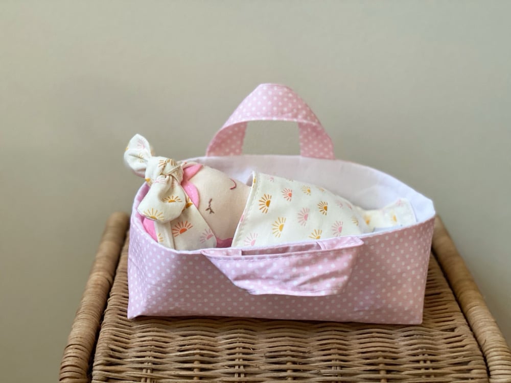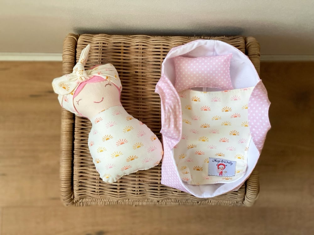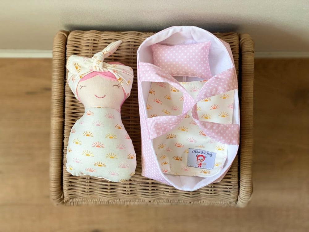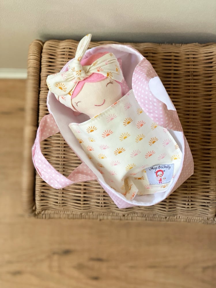 A soft cotton doll just perfect for little arms to cuddle….featuring felt hair & hand stitched face, each one unique & one of a kind….comes complete with their very own matching Basket with pillow & blanket…