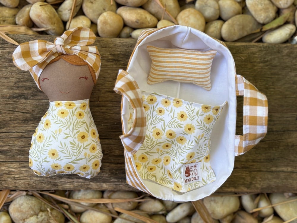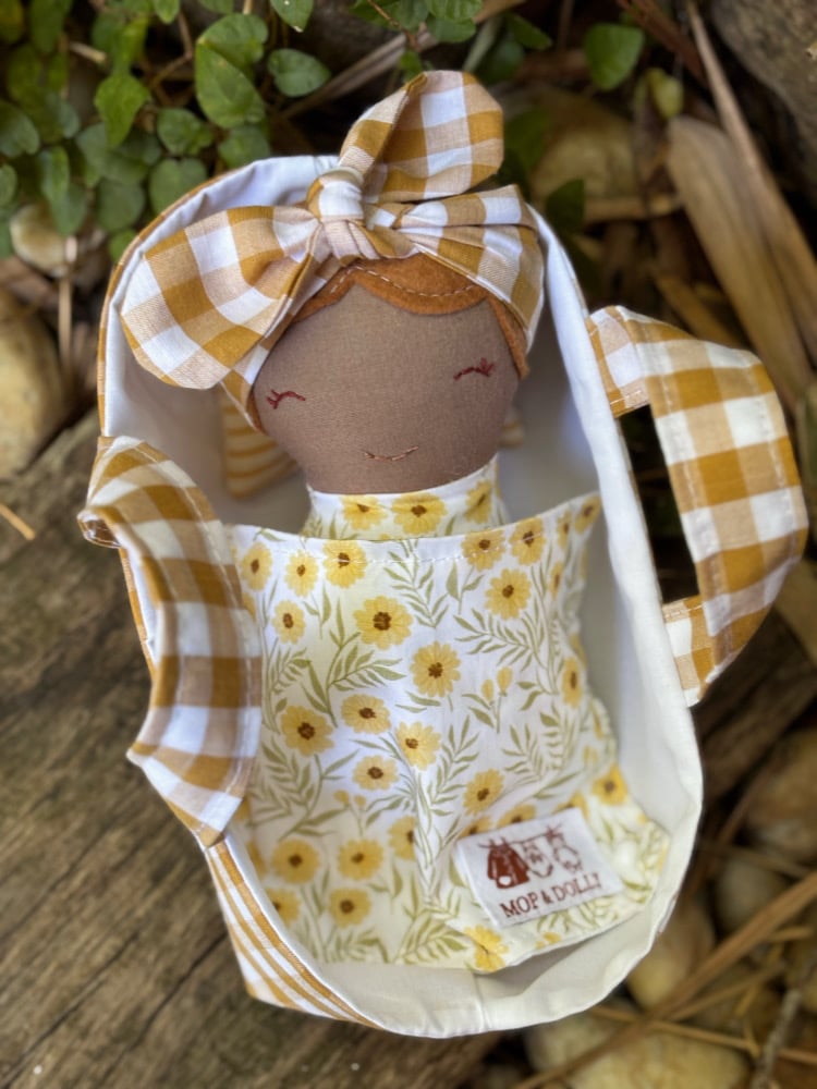 A soft cotton doll just perfect for little arms to cuddle….featuring felt hair & hand stitched face, each one unique & one of a kind….comes complete with their very own matching Basket with pillow & blanket…