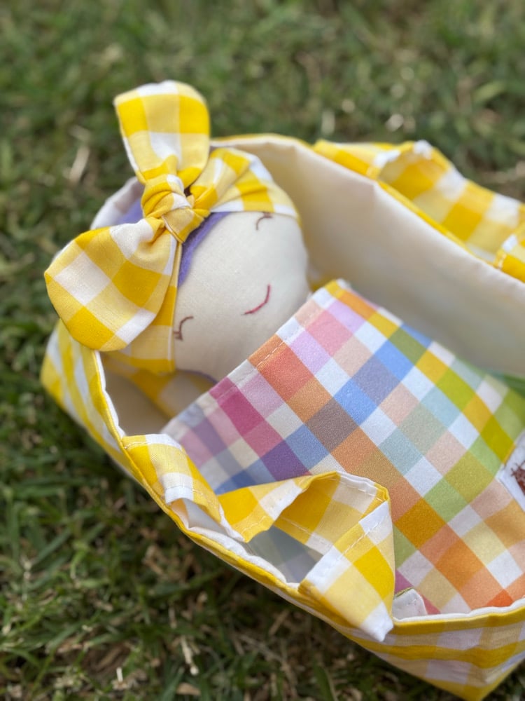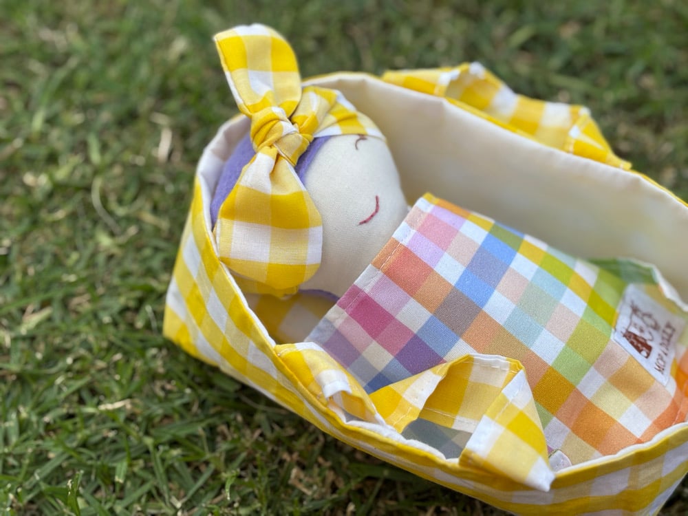 A soft cotton doll just perfect for little arms to cuddle….featuring felt hair & hand stitched face, each one unique & one of a kind….comes complete with their very own matching Basket with pillow & blanket…