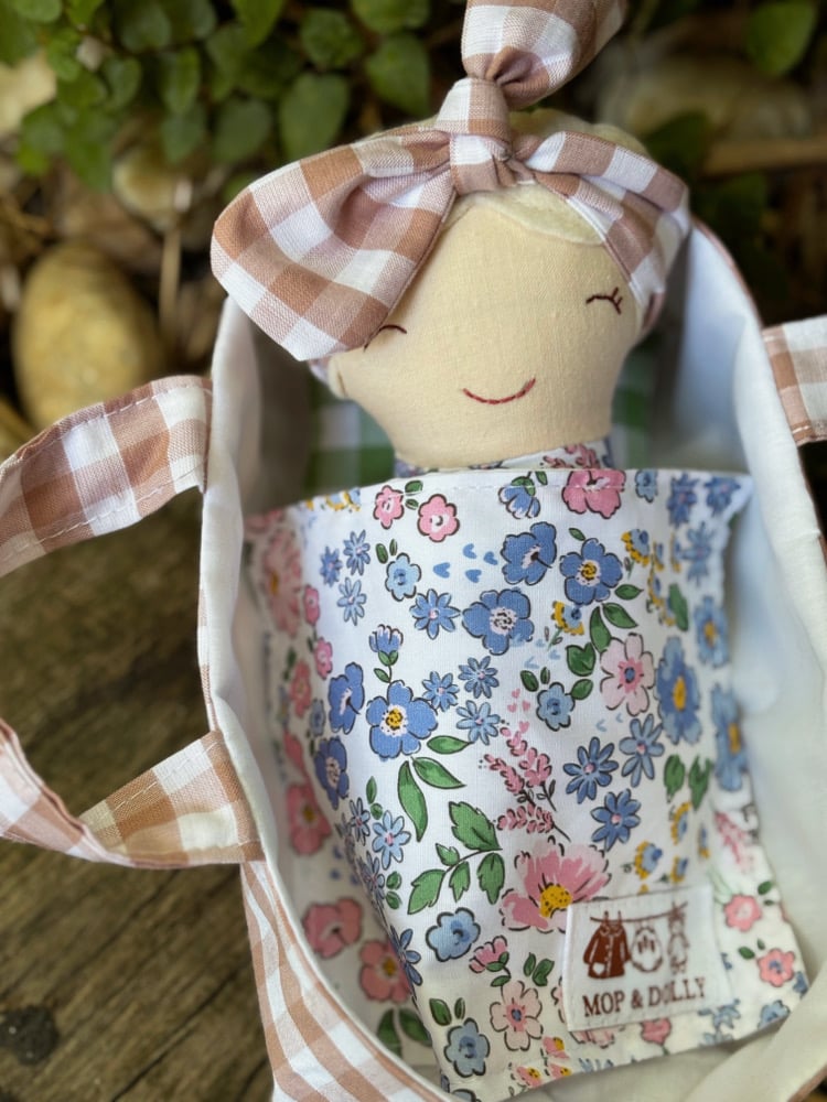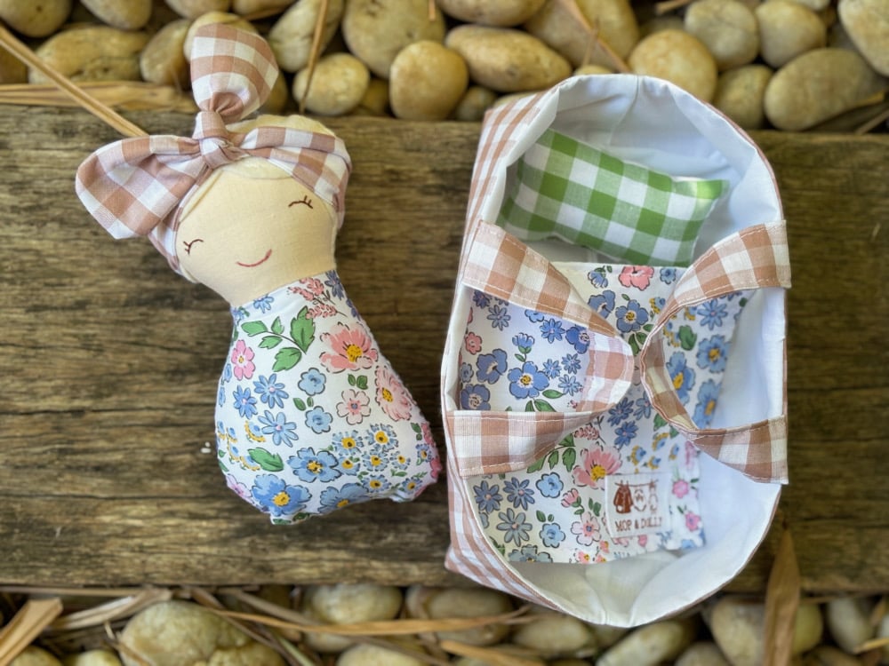 A soft cotton doll just perfect for little arms to cuddle….featuring felt hair & hand stitched face, each one unique & one of a kind….comes complete with their very own matching Basket with pillow & blanket…