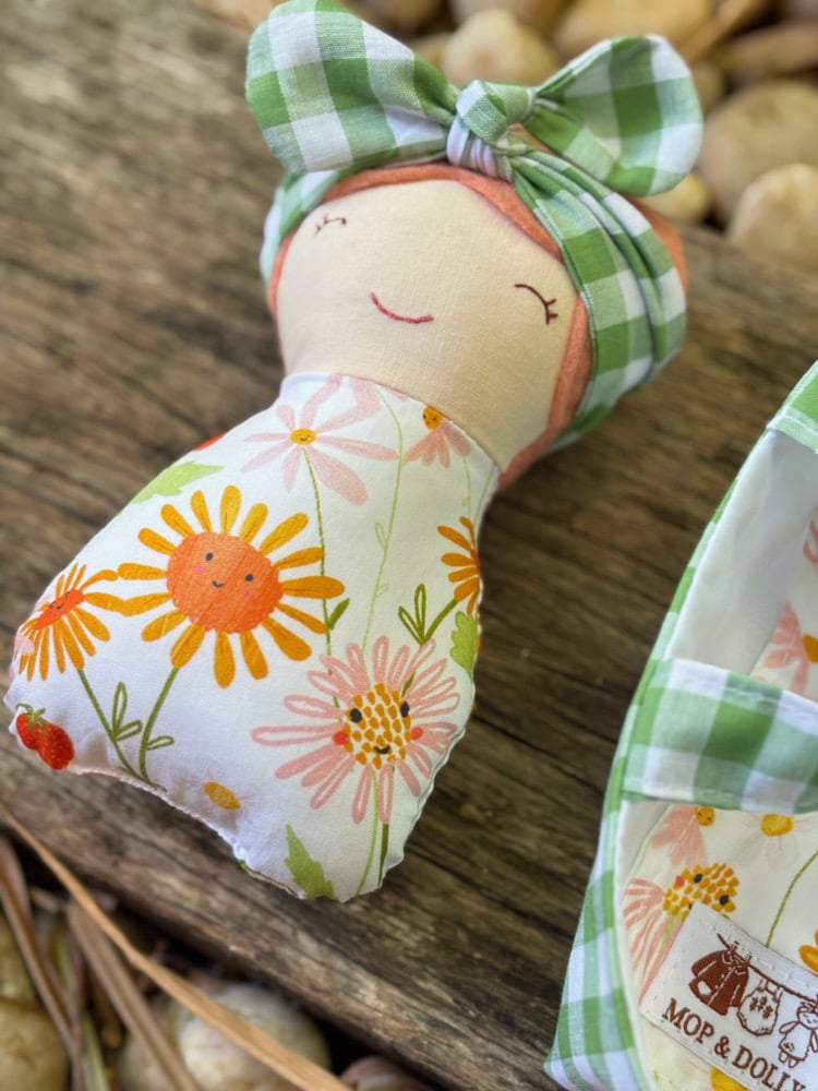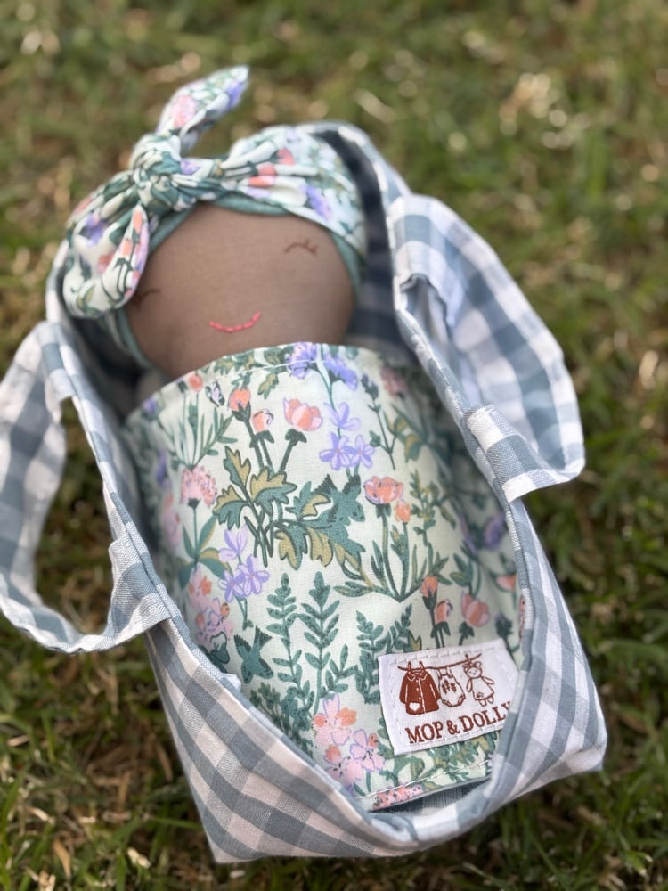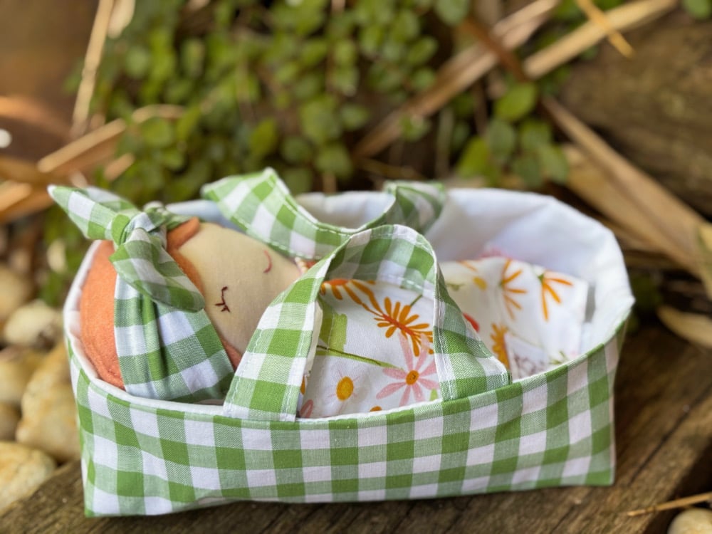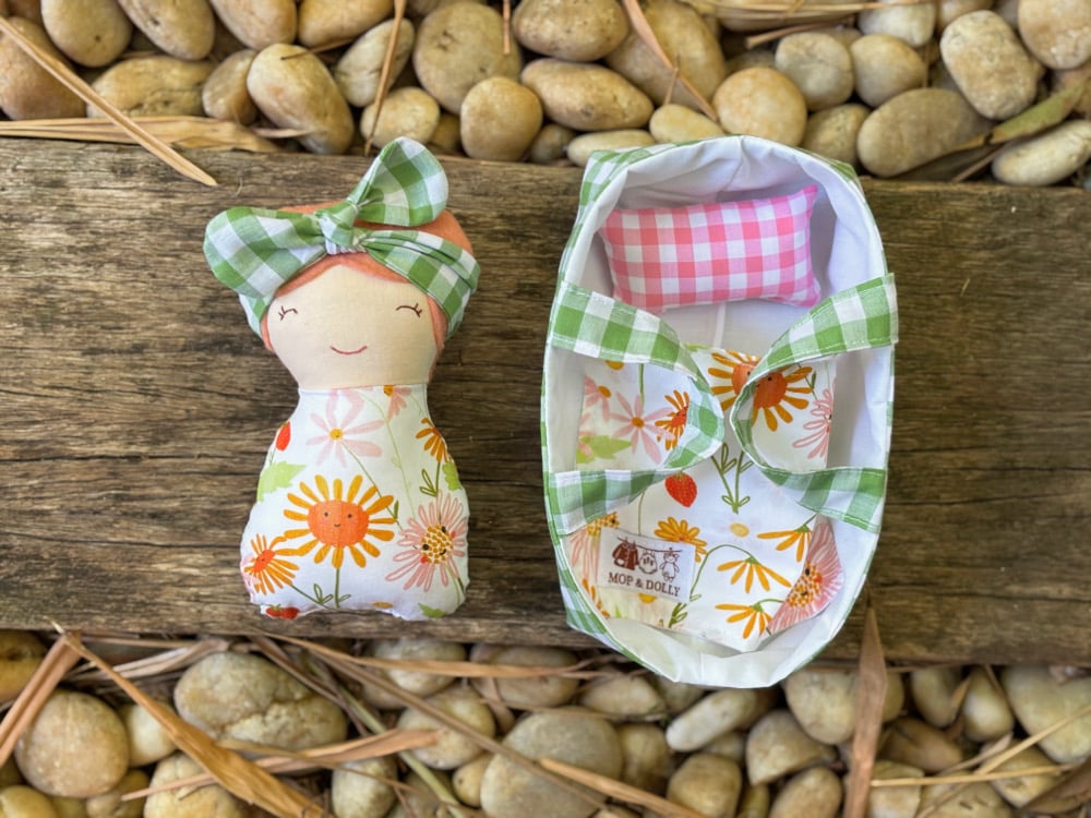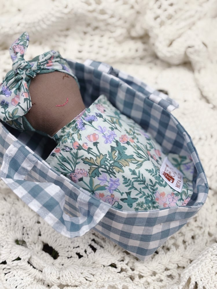 A soft cotton doll just perfect for little arms to cuddle….featuring felt hair & hand stitched face, each one unique & one of a kind….comes complete with their very own matching Basket with pillow & blanket…