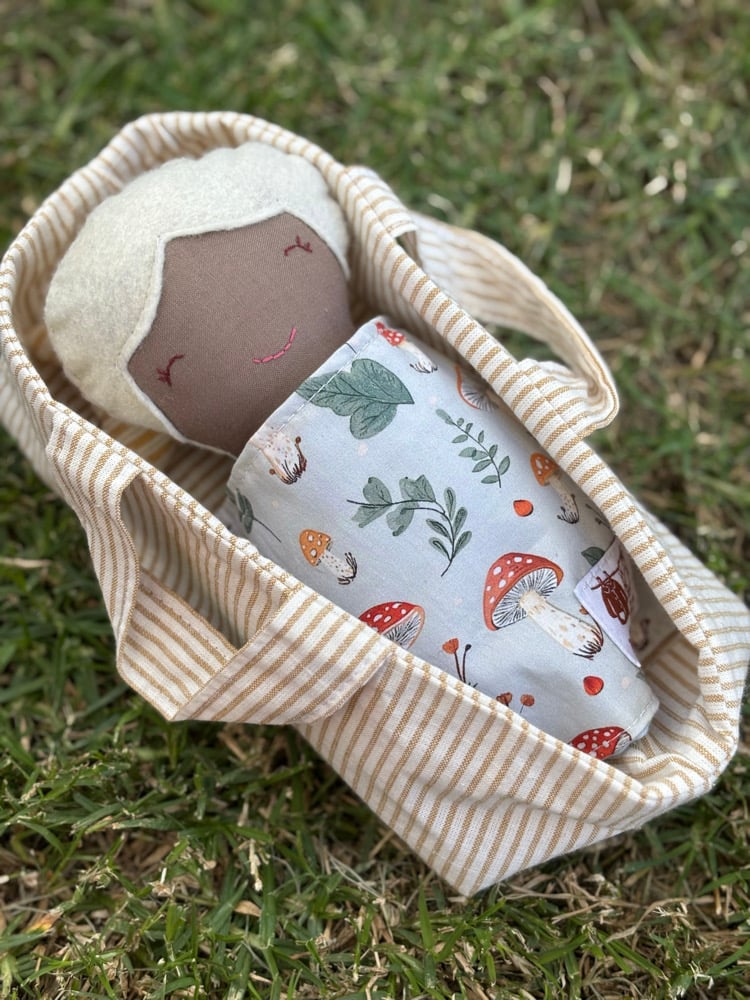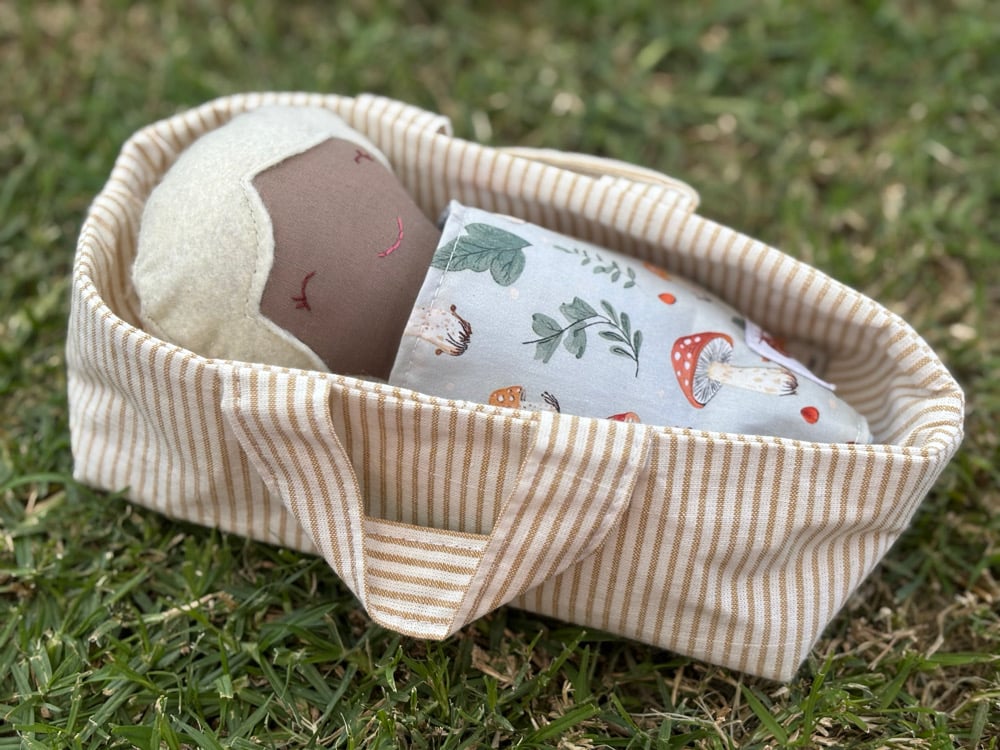 A soft cotton doll just perfect for little arms to cuddle….featuring felt hair & hand stitched face, each one unique & one of a kind….comes complete with their very own matching Basket with pillow & blanket…
