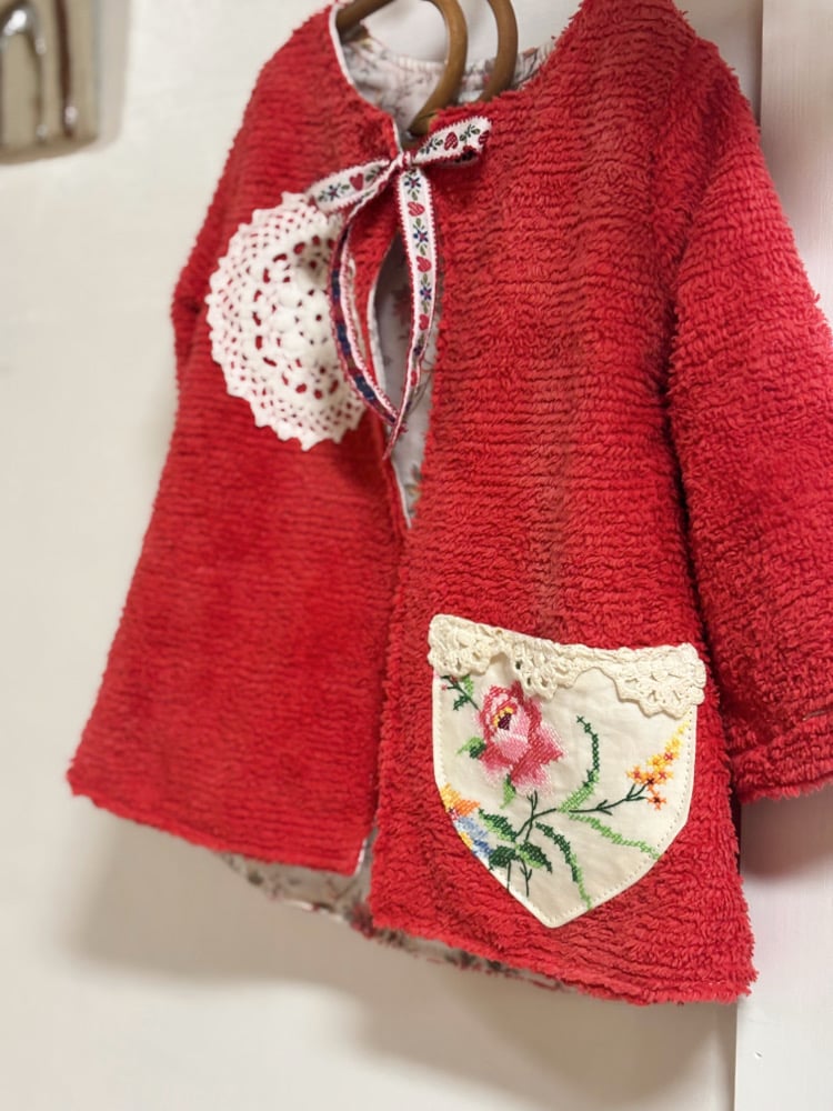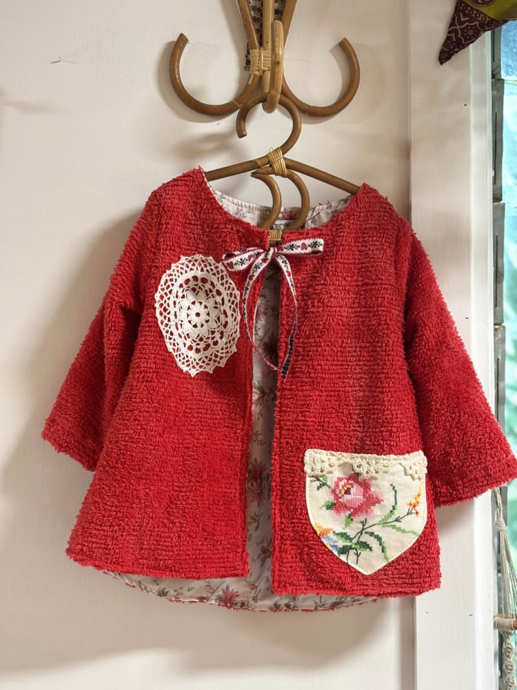 Introducing our charming vintage chenille coats, specially crafted for children with a touch of nostalgia and sustainability in mind. Each coat is a unique masterpiece, lovingly upcycled from vintage chenille bedspreads and adorned with carefully selected treasures from yesteryears, such as velvet ties and exquisite doilies. Your little ones will not only stay cozy and warm but will also stand out with style and eco-conscious flair. Embrace the timeless charm of bygone eras while making a statement for a brighter, greener future with our vintage chenille coats for kids.