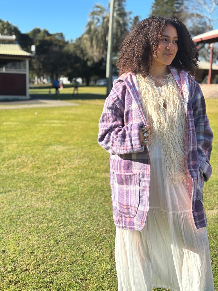 Designed with an oversized fit, it comfortably suits sizes 8-12, offering a relaxed and effortless look. The addition of a hood enhances its practicality, providing extra warmth and protection against the elements. Ideal for chilly days, this coat embodies both fashion and function, making it a must-have for those who value comfort and sustainability.